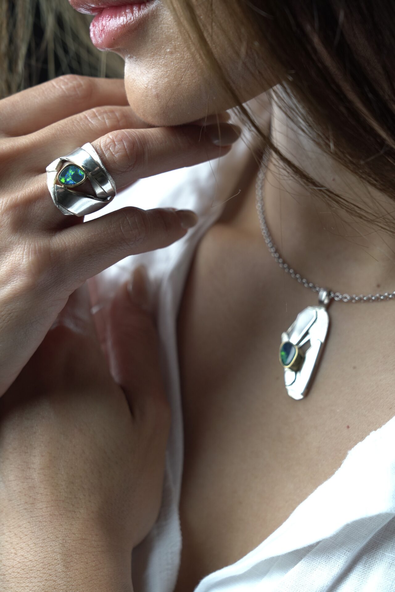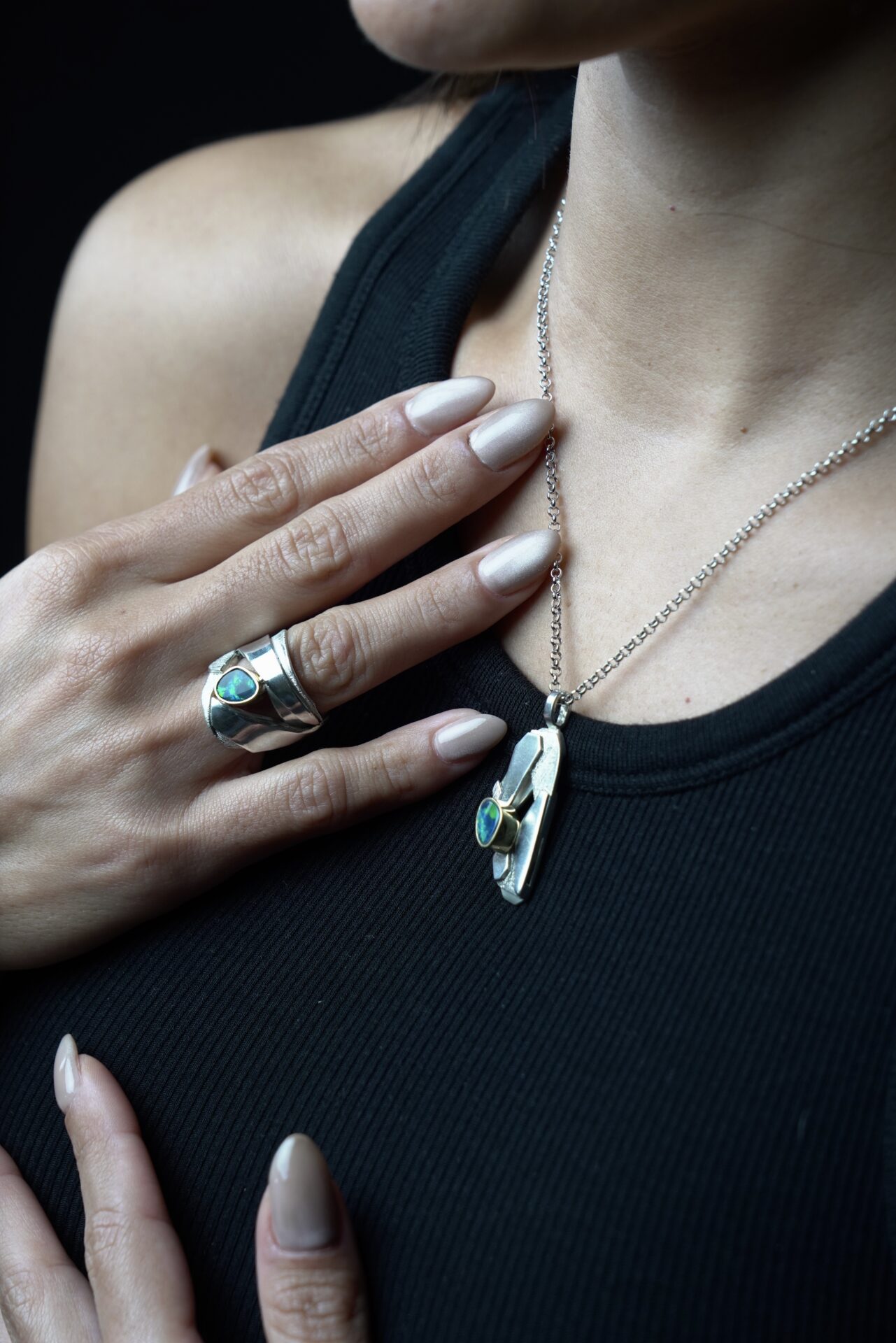 Anillo de plata, oro amarillo y ópalo negro