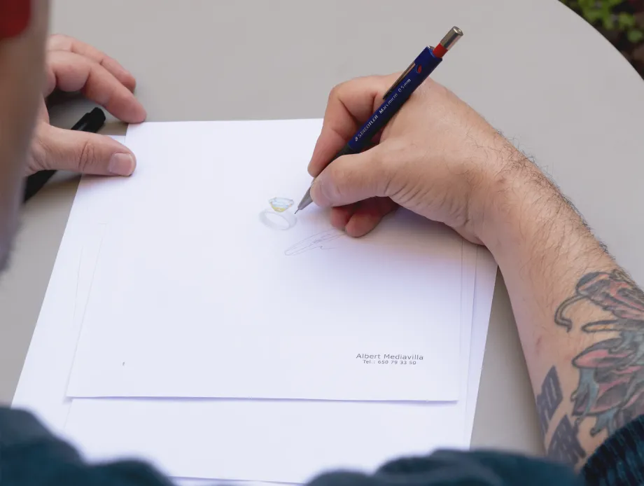 Treballem amb metalls nobles —plata, or, titani— i una acurada selecció de pedres facetades, adaptant cada disseny a les preferències i al pressupost de cada client. Cada projecte neix del diàleg i es desenvolupa des del respecte per allò que és únic.